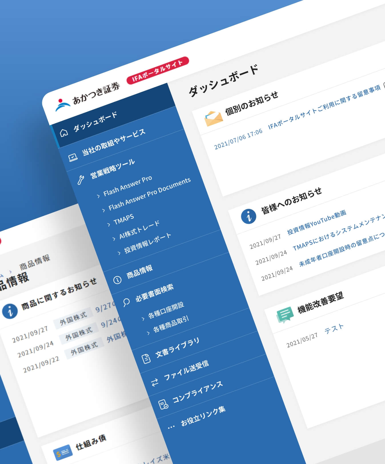 - あかつき証券様の金融商品仲介業者(IFA)支援サービスにおいて、提携IFA事業者が利用するIFA向けサイトのUIデザインを担当しました。