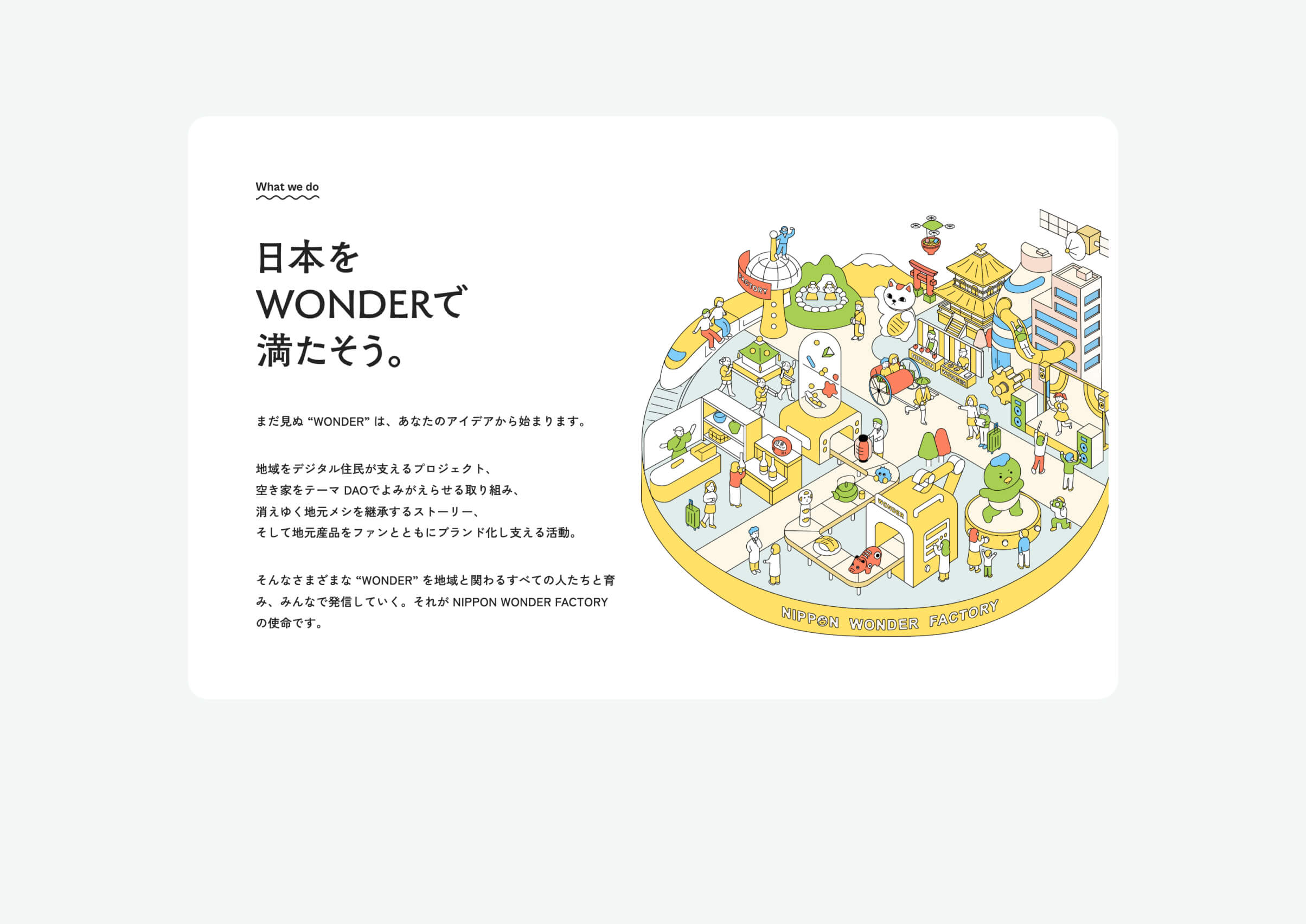 - 株式会社電算システム様が立ち上げた観光・地域創生共創プロジェクト「NIPPON WONDER FACTORY」のWebサイト制作を担当しました。
